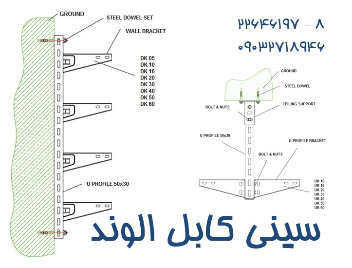 انواع براکت برای نصب سینی کابل و یانردبان کابل که به صورت نصب دیواری ، نصب زمینی و نصب سقفی قابل سفارش میباشد .